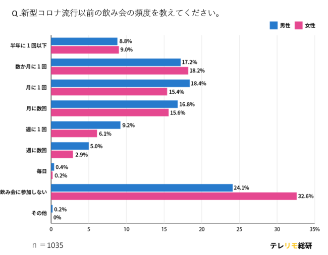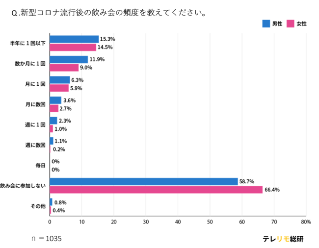 一方、流行後は、飲食店での飲酒の規制、自粛の影響などを受け、飲み会の頻度が大幅に減少し、全体の1割程度にとどまりました。また、「飲み会に参加しない」と回答された方も男女ともに2倍に増加していることが分かりました。
