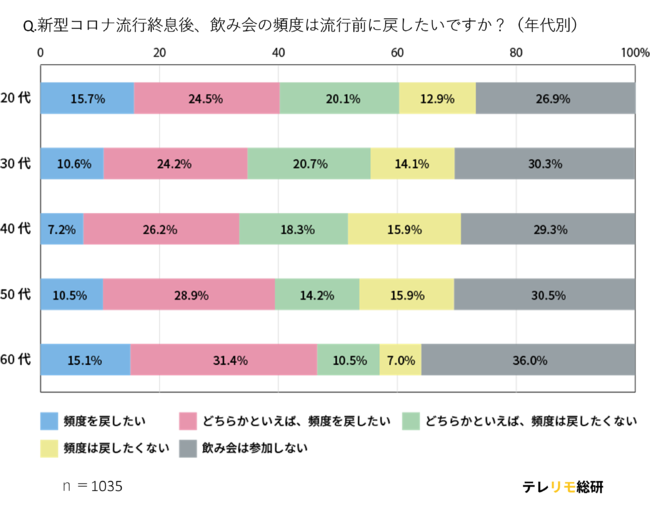 続いて、「コロナ流行収束後、流行以前の飲み会頻度に戻したいか」についてアンケートを実施しました。年齢別の調査結果は以下の通りです。