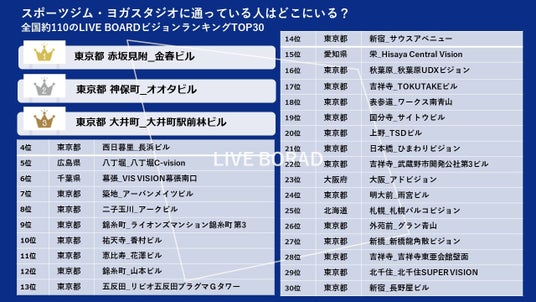 株式会社 LIVE BOARD(本社:東京都渋谷区、代表取締役社長:櫻井 順 以下、LIVE BOARD)は、NTTドコモの「docomo Sense(TM)※1(旧名、顧客理解エンジン)」や「docomo data square(R)※2」等を活用し、LIVE BOARD屋外ビジョンにおける分析を実施しています。夏は室内外の温度差などで体調を崩すこともあります。夏バテ解消には適度な運動をすることも良いとされており、暑さを乗り切るために体を動かすことは効果的です。そこで今回は、LIVE BOARDネットワークの対象となる全国約110の屋外ビジョンから“スポーツジム・ヨガスタジオに通っている人”が多いビジョンをランキング化しました。