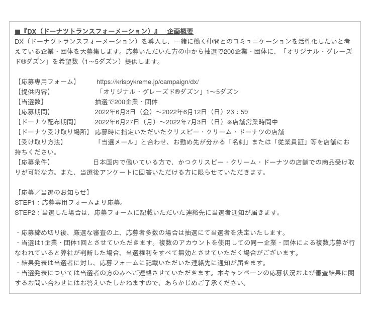 毎年6月の第一金曜日に祝われるドーナツの記念日“ナショナル ドーナツデー※”より、『DX(ドーナツトランスフォーメーション)』企画をスタートします。 『DX(ドーナツトランスフォーメーション)』を導入し、一緒に働く仲間とのコミュニケーションを活性化したいと考えている企業・団体を大募集。応募いただいた方の中から抽選で200企業・団体に、「オリジナル・グレーズド(R)ダズン」を希望数(1~5ダズン)提供します。