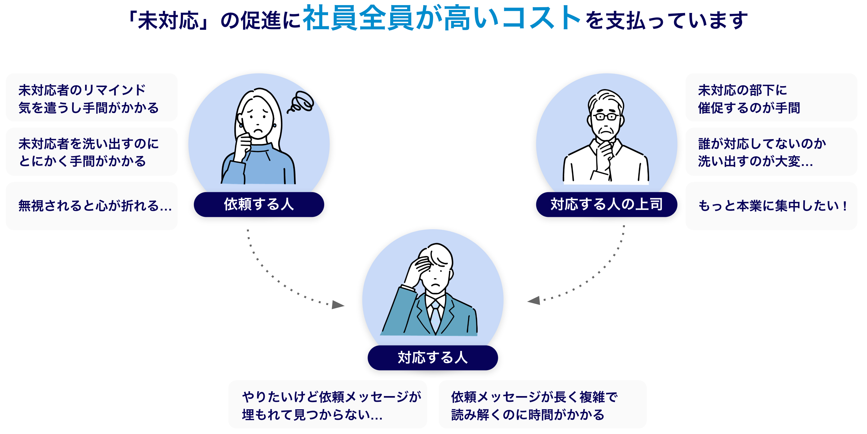 依頼をする社員は、毎日Slackやメールでの催促業務に大幅な時間を浪費し、かつ「対応してくれないストレス」に頭を悩ませています。
