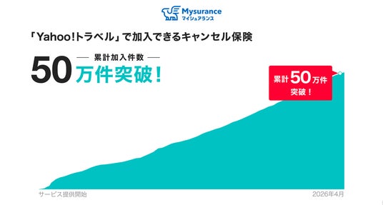 損害保険ジャパン株式会社(本社:東京都新宿区、代表取締役社長:石川 耕治)の子会社で少額短期保険業を営むMysurance(マイシュアランス)株式会社(本社:東京都新宿区、代表取締役社長:清水 廣臣、以下、「Mysurance」)が、LINEヤフー株式会社のグループ会社であるPayPay保険サービス株式会社(本社:東京都千代田区、代表取締役社長CEO:新井 京介、以下、「PayPay保険サービス」)と共同で、LINEヤフーが運営するインターネット旅行予約サービス「Yahoo!トラベル」において提供するキャンセル保険(宿泊キャンセル・旅行キャンセル・フライト遅延)の累計契約件数が50万件を突破したことをお知らせします。