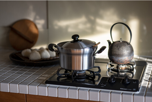 今回、茅乃舎特注仕様としてIH調理器対応の文化鍋を北陸アルミニウム様におつくりいただきました。また、表面の光沢を抑えたことで使い始めからそっと台所に馴染んでくれます。