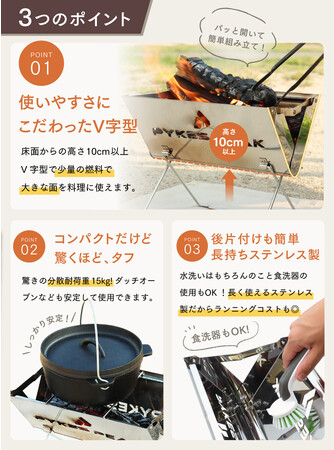V字型の形状は少ない燃料で火を起こせるので、荷物も減らすことができます。