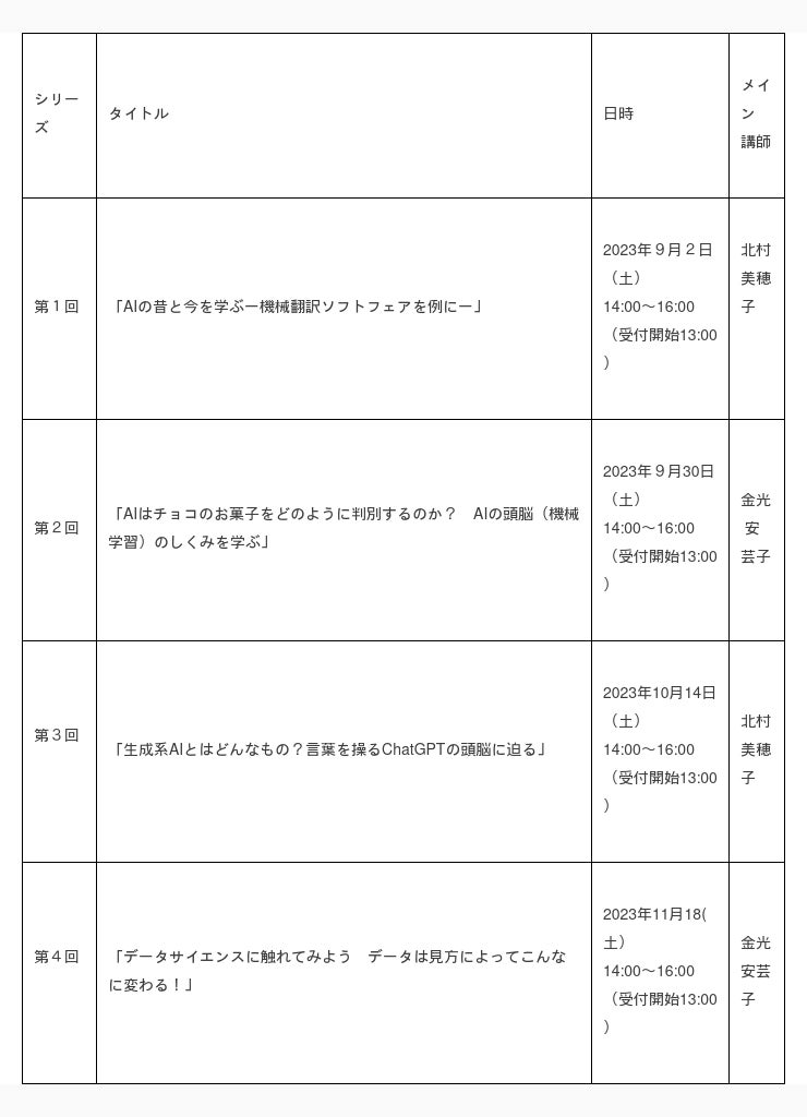 「文系女子大学が提案するDXリカレント講座」と題し、一般の方に理解しやすい構成としています。生成系AI(ChatGPT等)の歴史をはじめ、機械学習の仕組みの解説、本学での活用事例を紹介します。この講座は、京都市の「ふるさと納税を活用した大学における地域連携等推進事業」の一環として開催され、個人での参加だけでなく、企業研修としての活用も可能です。