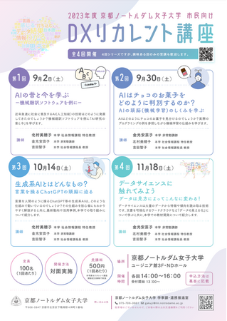京都ノートルダム女子大学(学長:中村久美、所在地:京都府京都市左京区)は、2023年9月から11月にかけてDXリカレント講座を開催します。