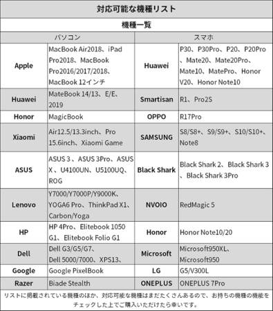 ※HDMI出力端子とUSB Type-C(映像出力に対応)を搭載していれば、ほとんどの機器が伝送可能です。お持ちのスマホが記載されいない場合、いつでも気軽に弊社にお問い合わせください。