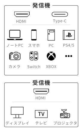 「HT02」は幅広いデバイスに対応しています。伝送元として、ゲーム機などはもちろん、HDMI出力端子とUSB Type-C(映像出力に対応)を搭載していれば、ほとんどの機器が伝送可能です!