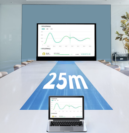 「HT02」は高性能アンテナを搭載しており、スマートデバイスとの間に障害物がない場合では最大25メートル先へ映像と音声データをワイヤレス伝送可能。広い部屋だけではなく、会議室など仕事場にも簡単に対応できます。