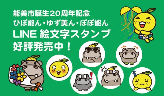 能美市誕生20周年を記念して、市公式キャラクター「ひぽ能ん・ゆず美ん・ぽぽ能ん」のLINE絵文字スタンプを作成しました。普段使いできる全40種類のかわいい絵文字でトークがもっと楽しくなります。ぜひダウンロードして、ご使用ください♪
