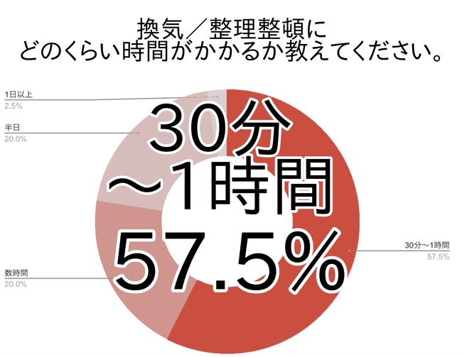 逆に4割以上(42.5%)の方は換気と整理整頓に数時間以上かかると回答しており、中には「半日(20.0%)」・「1日以上(2.5%)」と答える方もいらっしゃいました。