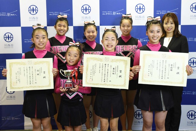 10月5日、第31回関西チアリーディング選手権大会の「自由演技競技DIVISION1小学校高学年の部」で優勝、「自由演技競技DIVISION1中学校の部」で準優勝。その後、開催された「JAPANCUP2022チアリーディング日本選手権大会」結果報告のため、同チームに所属している7名が川西市役所(中央町12-1)を表敬訪問。越田謙治郎川西市長に今後の抱負などを語った。