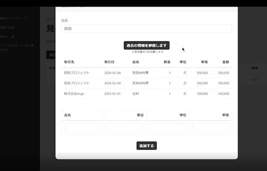 4.新たな書類を作成する際に、過去のデータを参照できます。品目を入力すると、過去のデータから類似したデータを抽出します(”木材”と入力すると、過去の書類から木材関連の内容が品目に含まれているデータの取引先、数量、金額などをいくつか表示します)。