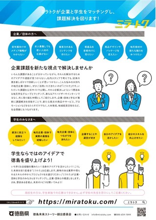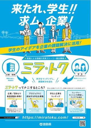 徳島県は、既存の枠組みにとらわれない若者たちの感性で、企業・団体等が抱える課題解決に一緒に取り組むため、若者にはコロナ禍で失われている成長機会を、企業・団体には若者目線による新たなアイディアを提供する「若者による地域の未来ストーリー創出事業(ミラ★トク)」を令和3年度から実施しております。