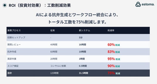 FTSE対応の主要業務(レビュー・抗弁・英訳・検証)をAIと統合ワークフローで効率化し、総工数を125時間→31.5時間(75%削減)します。セットアップは5分、英訳やスコア検証まで一気通貫で短縮し、担当者はスコア改善に集中できます。