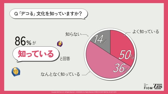 Z世代の86%が「デコ」という文化を認知しており、「よく知っている」36%、「なんとなく知っている」50%を合わせ、言葉自体の説明が不要なほど共通認識化されています。