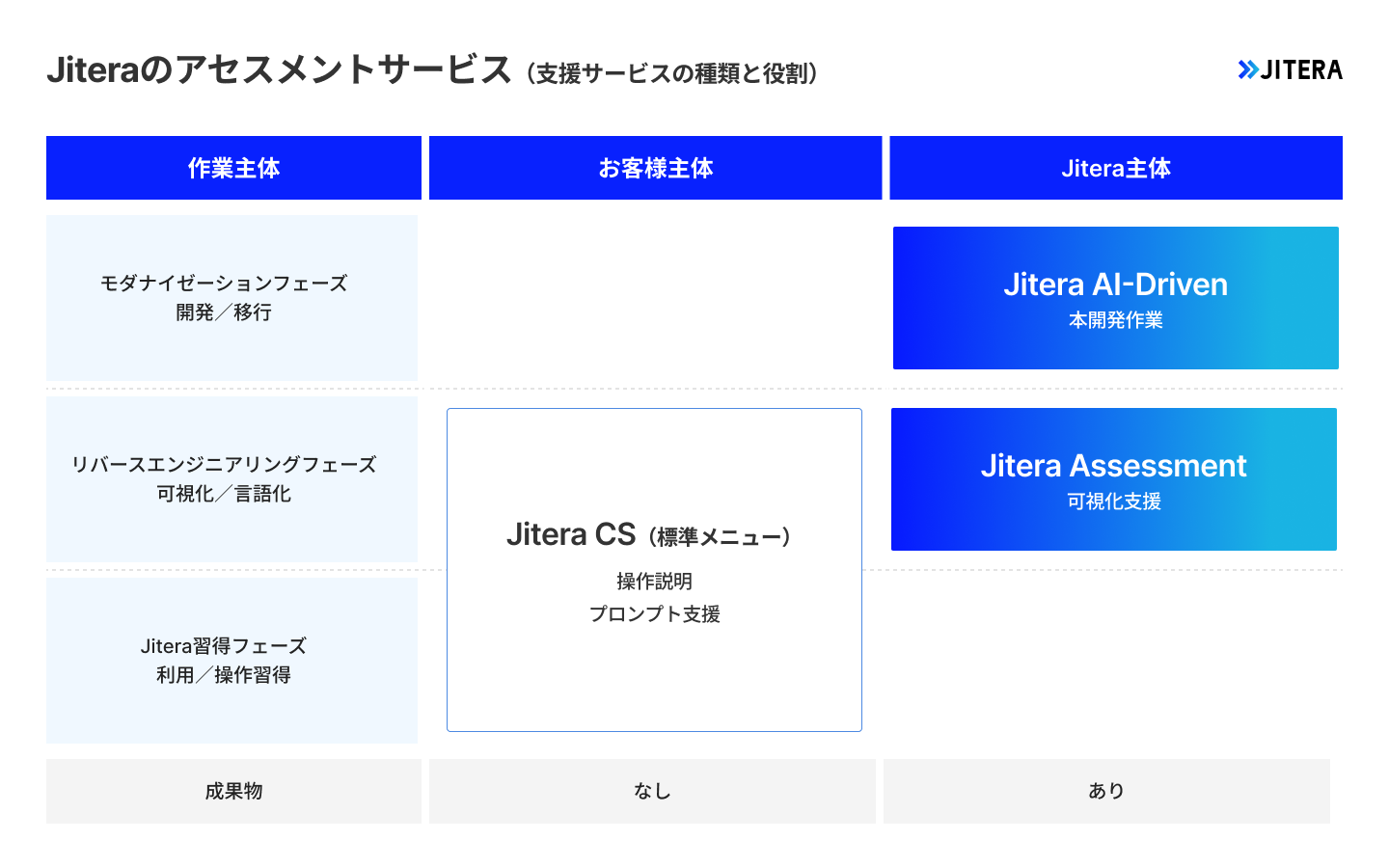 開発AIエージェント「Jitera」を提供する、株式会社Jitera(本社:東京都、代表取締役:柳澤 直、以下「Jitera」)は、AIにより既存システムの現状を可視化・言語化し、現状把握と移行計画を支援する「Jitera Assessment」、当社が本開発作業を支援する「Jitera AI-Driven」の2つの新サービスを提供開始しました。