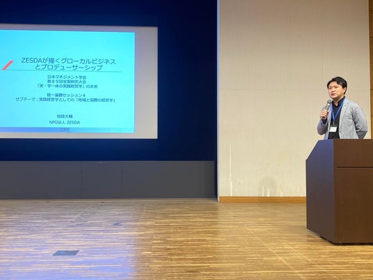 6月7日に開催された日本マネジメント学会に、代表の桜庭が登壇しました。「ZESDAが描くグローカルビジネスとプロデューサーシップ」と題して、ZESDAが行ってきたグローカルビジネスの事例や、活動を通じて見えてきたプロデューサーシップの重要性について講演しました。