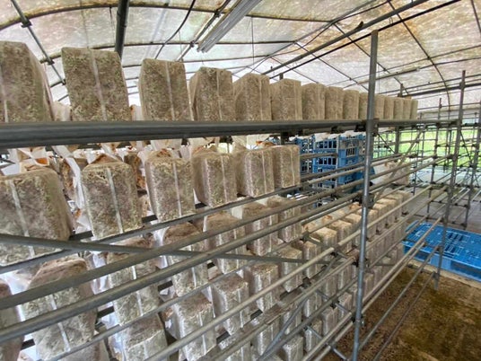 ▲棚に並べ終えた菌床ブロック