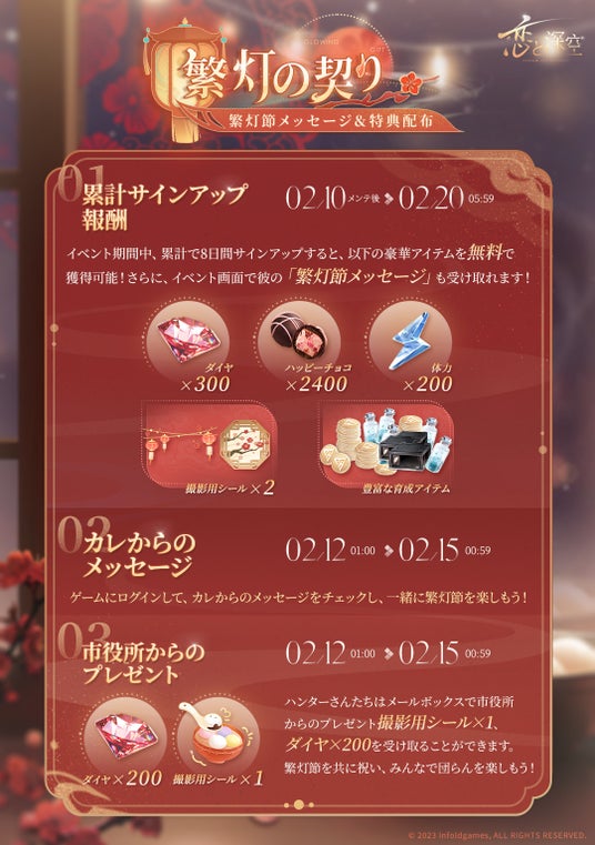 イベント説明:イベント期間中、ゲームにログインしてイベントページでサインアップすると、カレからの繁灯節メッセージ、限定シール&豪華報酬を無料で受け取れます。