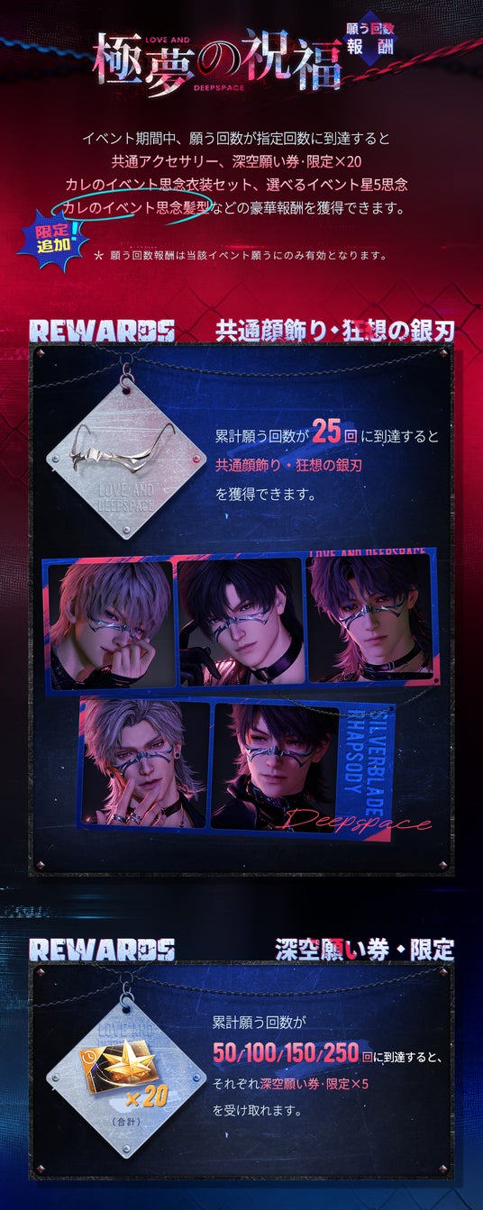 イベント説明:イベント期間中、累計願う回数が指定の回数に到達すると、共通顔飾り【狂想の銀刃】、【深空願い券・限定×20】、カレの【イベント思念衣装&髪型】、選べる【当期イベント限定星5思念】などの豪華報酬を獲得できます。