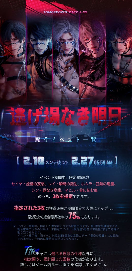イベント説明:イベント期間中、限定星5思念【セイヤ・虚構の妄想】、【レイ・瞬時の錯乱】、【ホムラ・狂熱の用量】、【シン・罪なき鳥籠】、【マヒル・骨に刻む痕】のうち指定された3枚の獲得確率が期間限定で大幅にアップします。この3枚の獲得確率は、星5思念を獲得できる総合確率のうちの75%になります。