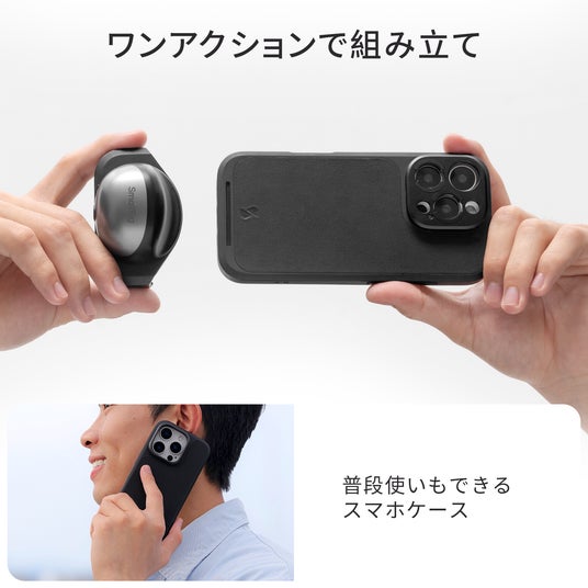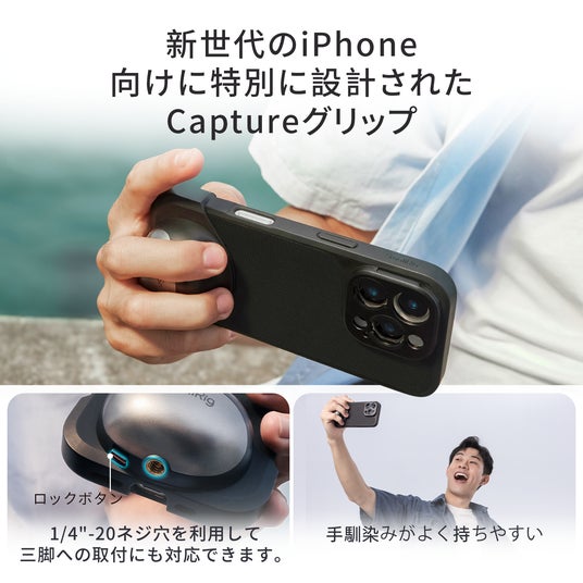 iPhone 16 Pro / Pro Max 用FilMovスマホ用写真撮影キットは、新世代のiPhone 16シリーズ向けに特別に設計された写真撮影専用のキットです。iPhone 16シリーズの「カメラコントロール」に合わせて特別に設計された「Captureグリップ」は、ケースにワンアクションで装着でき、手馴染みがよく持ちやすいです。グリップ上の1/4"-20ネジ穴を利用して三脚への取り付けにも対応しています。