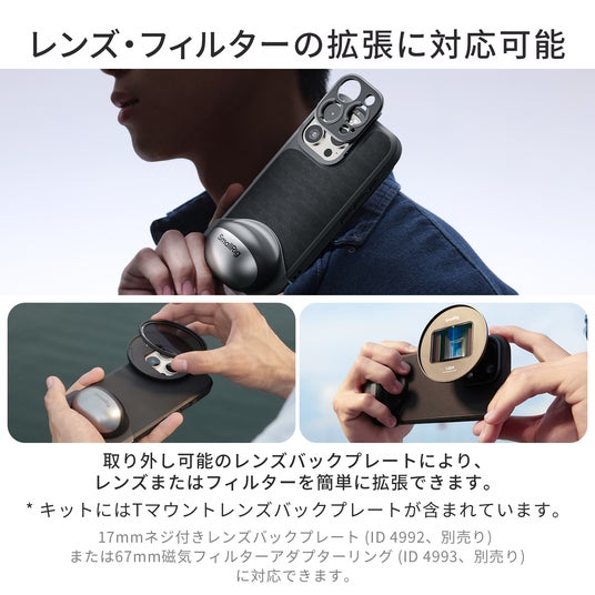 レンズ部分には、Tマウントレンズバックプレート、17mmネジ付きレンズバックプレート(ID 4992、別売り)や67mm磁気フィルターアダプターリング(ID 4993、別売り)を装着でき、外付けレンズやフィルターなどを簡単に取り付けることができます。