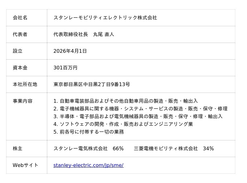 スタンレー電気株式会社(代表取締役 社長執行役員:貝住 泰昭、本社:東京都目黒区)と三菱電機モビリティ株式会社(代表取締役 取締役社長:田中 和徳、本社:東京都千代田区)の両社出資による合弁会社である、スタンレーモビリティエレクトリック株式会社(代表取締役社長:丸尾 直人、本社:東京都目黒区)が、本日4月1日に事業活動を開始しましたのでお知らせいたします。