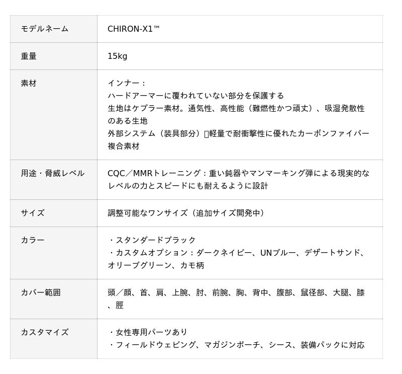 耐高衝撃近接戦闘トレーニングスーツ「CHIRON-X1(TM)」