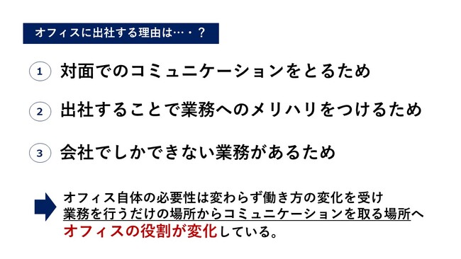 また、コロナ禍では感染防止の観点から、出社時は向かい合わず全員が同じ方向を向くスクール形式で業務を行っていました。しかし、約3年間テレワーク勤務がメインの働き方を継続する中、社内では状況に合わせ出社をするメンバーも増え、本社勤務の社員を対象に行った働き方に関するアンケートを実施した結果、オフィスの役割が変化している事が分かりました。