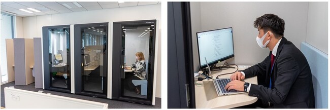 オンライン会議時に気になる周りの雑音を防ぐために防音個室の1人専用会議室を設置。