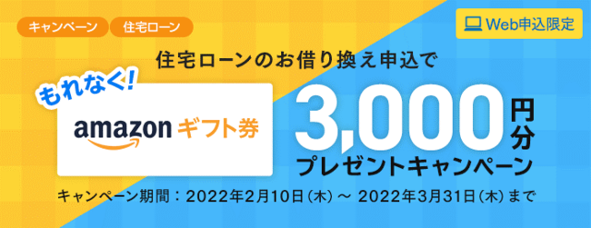 株式会社新生銀行(東京都中央区、代表取締役社長 川島克哉)は、他の金融機関から当行住宅ローンへの借り換えのお申し込みをいただいた方を対象にAmazonギフト券3,000円分をプレゼントする「≪Web申込限定≫住宅ローンのお借り換え申込でもれなくAmazonギフト券3,000円分プレゼントキャンペーン」を実施いたします。