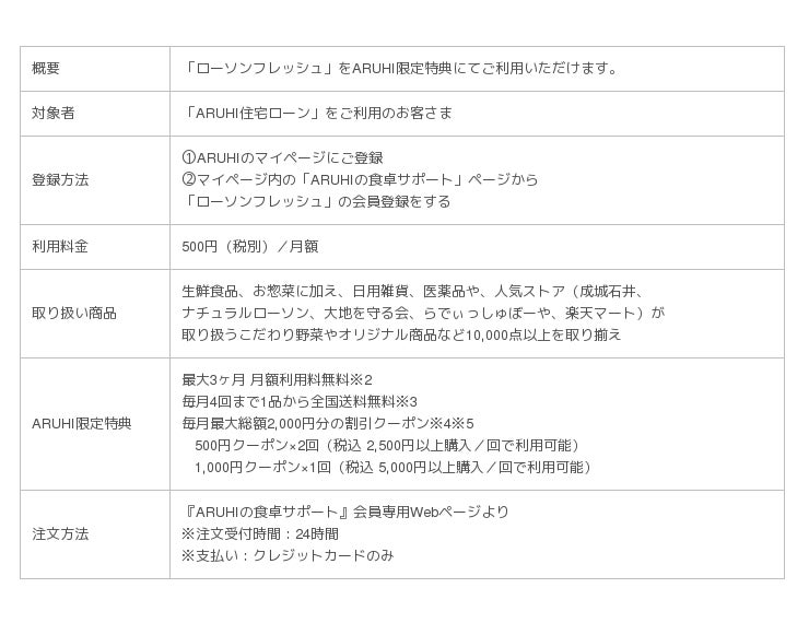 『ARUHIの食卓サポート』は、ARUHI住宅ローンをご利用のお客さまが、月額利用料金500円(税抜)で便利なネットスーパーサービス「ローソンフレッシュ」をARUHI限定特典で利用できるサービスです。限定特典は、月会費が最大3ヶ月無料※2となるほか、毎月4回まで1品から全国送料無料※3、毎月最大総額2,000円分の割引クーポン※4※5を発行します。
