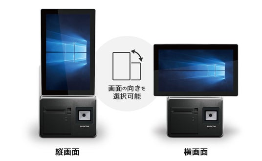 卓上型キオスク端末「Seav-MK」と自動釣銭機を組み合わせたレジセットで、ディスプレイの縦向き・横向きを選択して運用できます。
