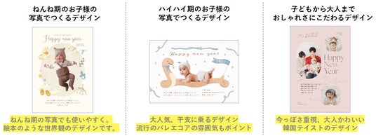 “ねんね期のお子様の写真でつくる年賀状”“ハイハイ期のお子様の写真でつくる年賀状”“少し成長したお子様や、ご夫婦の写真でつくる年賀状” という3つの切り口で、ママたちが今、おしゃれだと感じているテイストを組み合わせてデザインを作り上げています。おしゃれでかわいい、というだけでなく、写真の入れやすさ、デザインとしての使いやすさを、実際に年賀状作りを行うお客様の目線に立って作った3つのデザイン。ぜひ一度「スマホで写真年賀状」でチェックしてみてください。