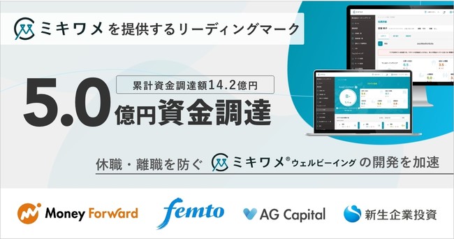 Personality Techを通じたHR事業「ミキワメ」を提供する株式会社リーディングマーク(本社:東京都港区、代表取締役社長:飯田 悠司)は、マネーフォワードをリードインベスターとして、フェムトパートナーズ、AGキャピタル、新生企業投資の4社を引受先とする第三者割当増資により、5.0億円の資金調達(累計資金調達額14.2億円)を実施しました。マネーフォワードとは、「マネーフォワード クラウド人事管理」などの人事労務領域のプロダクト連携を行い、事業拡大に取り組む予定です。