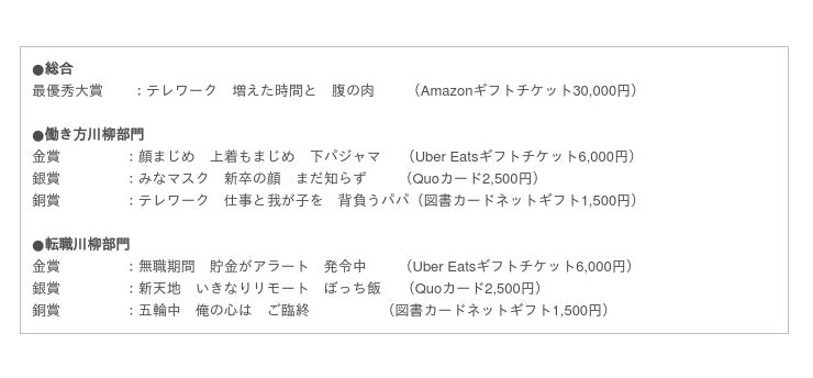 働き方と転職それぞれの部門で銅賞以上を受賞した作品は、どれもコロナ禍で働き方や価値観が変化した様を詠んだ時代を捉えた作品です。最優秀大賞の受賞は、その中でも特に同コンテストの趣旨にマッチし、近年の情勢を表しながら、ユーモアがあり共感を呼ぶ句が選ばれました。また、受賞作品だけではなく、応募で集まった全ての作品は、コロナ禍で苦しい中でも前進していこうとする全ての働く社会人を明るく前向きにしてくれる作品ばかりです。(受賞以外の作品:https://laibo.jp/info/20210818-2/)