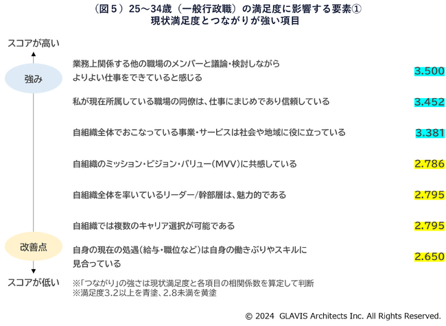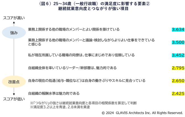 将来、行政業務の中心を担う一般行政職の若手・中間層(25~34歳)の総合満足度がどの項目と強く相関するかを分析しました。