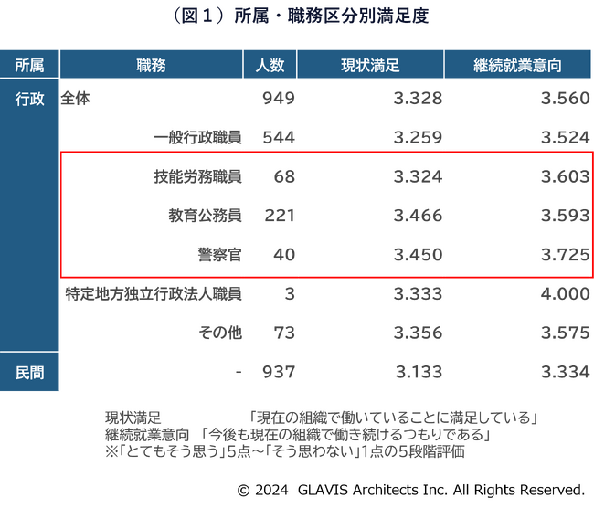 地方公務員の総合満足度は、民間企業と比較して高い傾向にありました。特に、専門職(「教育公務員」「警察官」)はその他と比較して高い傾向が見られました。行政業務を主に担う一般行政職員でも満足度の傾向は変わらず、民間企業と比較して高い傾向にあります。(図1参照)