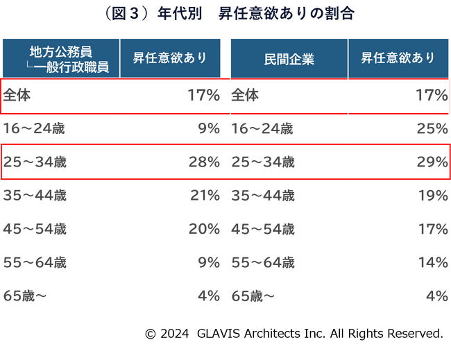 昇任意欲の有無は、地方公務員、民間企業いずれも差はなく、「意欲あり」は全体の17%と2割に届きません。一般行政職員の若手・中間層(25~34歳)をみても、昇任意欲に違いはありません。(図3参照)