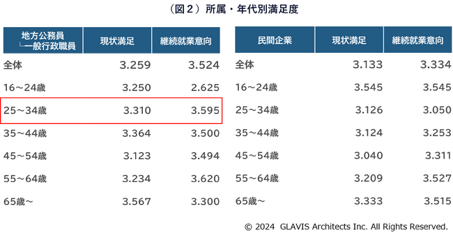 1.総合満足度:地方公務員は民間勤務者よりも満足度が高い傾向。若手・中間層(25~34歳)においても、満足度に変化は見られず。