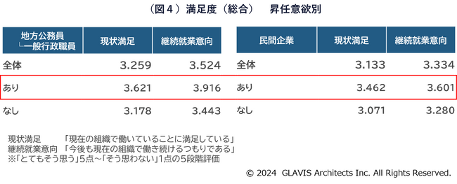 また「昇任意欲あり」の総合満足度は「意欲がない」と比較して高く、これは地方公務員、民間企業いずれも同じ傾向です。その中でも目指す職位が高いほど、総合満足度も高くなる傾向にあり、こちらも地方公務員、民間企業同様の傾向です。(図4参照)