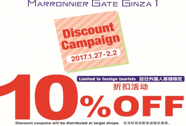 銀座の商業施設「マロニエゲート銀座1」(2017年1月1日より「マロニエゲート」から名称変更/東京都中央区銀座2-2-14 運営会社:三菱地所プロパティマネジメント株式会社)では、1月27日(金)~2月2日(木)の7日間、ファッション全18店舗と東急ハンズ銀座店にて、訪日外国人客の皆様を対象に「10%Discount Campaign」を開催いたします!