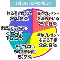 今年の「母の日」に何かプレゼントを贈るのか聞いたところ、「既にプレゼントを決めている」と回答した人は21.0%でした。「(不確定ながら)何かプレゼントを贈る予定」という声も32.8%を数え、全体の半数以上の人々が「母の日ギフト」を準備することが明らかとなりました。さらに「とりあえず会いに行くと喜ぶので、一応元気でいる姿を見せようと思う。そのあとは夕食を食べに行こうと考えている」(男性30代、大阪府)など、「モノでないものを贈る予定」(5.7%)という声も寄せられ、形があるか否かに関わらず、母への感謝の気持ちを表したいと考えている人がとても多いことがうかがえます。