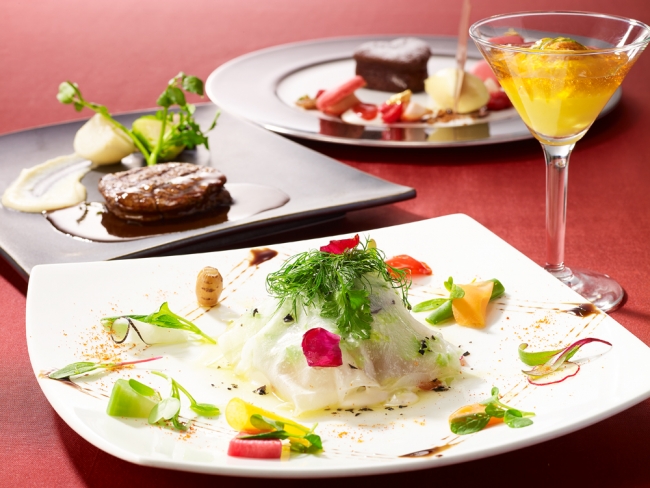 1日5組10名さま限定のディナーコースでは、オマール海老や真鯛、牛フィレ肉などを使用した料理のほか、ハート型にくり抜かれたショコラで彩った「ハートのフォンダンショコラ」を男性のお客様にご用意して、男性へのサプライズ演出をしたい女性を応援いたします。また、最上階からの眺望とともにスパークリングワイン(1本)もお楽しみいただけます。
