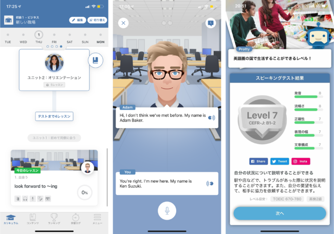 スピーキング特化型の英会話学習。ユーザーに合わせた最適なカリキュラムを提案、様々なシーンで英語フレーズ・英会話を体験