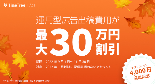 そしてこの度「TimeTree」登録ユーザー数4,000万突破を記念して、TimeTree Adsにご出稿いただく際の費用が3ヶ月間最大30万円割引になるキャンペーンを実施いたします。