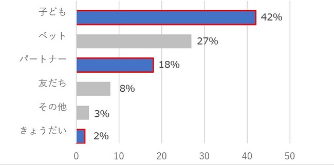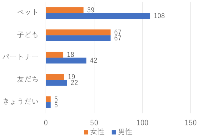 また、男女別で比較すると男性は249人中108人が「ペット」と回答しており、女性は子どもと回答した人が最も多い結果となりました。