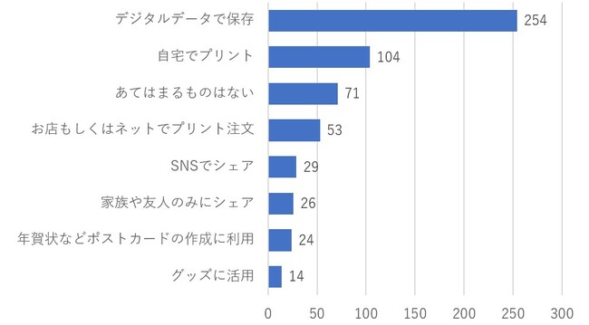 ペットを飼っている400人中、223人(55.7%)と半数以上の人が家にペットの写真を飾っており、さらにスマホやデジカメで撮影したデータをどのように保存しているか聞いたところ、「デジタルデータで保存」が254人と最も多い結果になりました。次いで「自宅でプリント」が104人、「お店もしくはネットで注文」も53人となり、デジタル文化が進む一方で写真をカタチに残す文化はいまだに根強く残っていると考えられます。